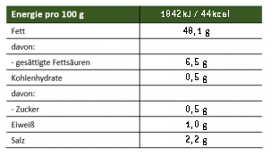 Inhaltsstoffe: 62% Bio Kalamata Oliven* mit Kern in 35% Vita Verde Bio Olivenöl eingelegt, Salz, Kräuter