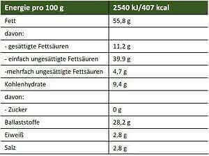 Zutaten: 97,2 % reife Oliven*, 2,8 % Meersalz